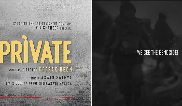 ഗാസയിൽ കൊല്ലപ്പെട്ട കുഞ്ഞുങ്ങൾക്ക് സ്ക്രീനിൻ്റെ പകുതി സമർപ്പിച്ച ‘പ്രൈവറ്റ്’ എന്ന ചിത്രത്തിലെ ആദ്യ ഗാനം സമൂഹമാധ്യമങ്ങളില് ചർച്ചയാകുന്നു. ഗാസയിൽ കൊല്ലപ്പെട്ട ആയിരക്കണക്കിന് നിഷ്കളങ്കരായ കുഞ്ഞുങ്ങൾക്ക് സ്ക്രീനിന്റെ പകുതി പങ്കുവച്ചു കൊണ്ടാണ് ചിത്രത്തിലെ ‘എലോൺ’ എന്ന പേരിലുള്ള ഫസ്റ്റ് സിംഗിൾ പ്രേക്ഷകരുടെ മുന്നിലെത്തിയിരിക്കുന്നത്. ടൈറ്റിൽ കാർഡിന്റെ ഫ്രെയിമിലെ പലസ്തീൻ പതാകയുടെ നിറത്തിലുള്ള ഓഡിയോ വേവും ശ്രദ്ധേയമാണ്.