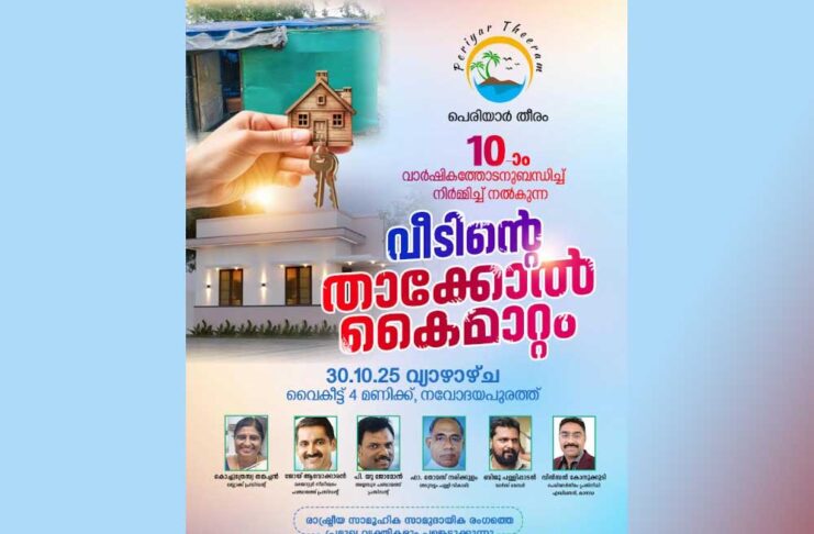 കാനഡയിലെ പെരിയാർതീരം അസോസിയേഷൻ മലയാറ്റൂരിൽ നിർമ്മിച്ച സ്നേഹവീടിന്റെ താക്കോൽ കൈമാറ്റം ഒക്ടോബർ 30-ന്