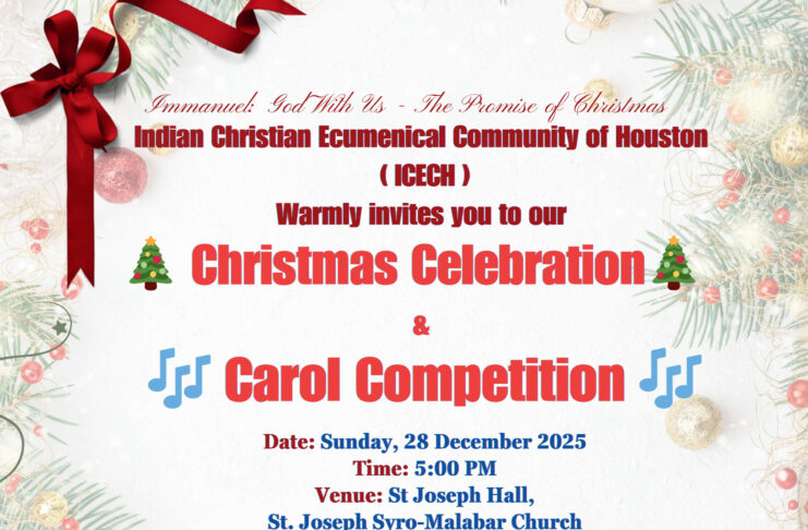 ഇന്ത്യൻ ക്രിസ്ത്യൻ എക്യൂമിനിക്കൽ കമ്മ്യൂണിറ്റി ഓഫ് ഹുസ്റ്റന്റെ (ICECH) ആഭിമുഖ്യത്തിൽ എല്ലാ വർഷവും നടത്തി വരുന്ന ക്രിസ്മസ് കരോളും കരോൾ ഗാന മത്സരവും 2025 ഡിസംബർ 28 നു വൈകിട്ടു 5 മണിക്ക് ഹുസ്റ്റൻ സെന്റ് . ജോസഫ് സീറോ മലബാർ ചർച്ച് ഹാളിൽ വെച്ചു നടത്തപെടുന്നു. ഹുസ്റ്റനിലെ ഇരുപതു പള്ളികൾ ചേർന്നുള്ള ഈ പരിപാടി വിപുലമായ കമ്മറ്റിയുടെ നേതൃത്വത്തിൽ നടത്തുന്നു.