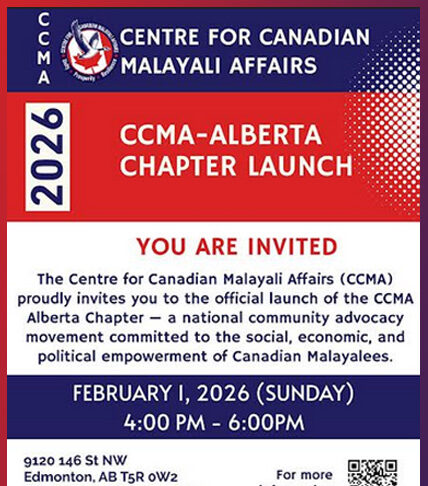 സെന്റർ ഫോർ കനേഡിയൻ മലയാളീസ് (സിസിഎംഎ) ആൽബർട്ട ചാപ്റ്ററിന് തുടക്കമാകുന്നു. ഫെബ്രുവരി ഒന്ന് ഞായറാഴ്ച വൈകിട്ട് നാലിന് എഡ്മിന്റൻ സെന്റ് അൽഫോൻസ സിറോ മലബാർ ചർച്ച് മീറ്റിങ് ഹാളിലാണ് പരിപാടി. മലയാളി സമൂഹത്തിലെ നേതൃനിരയിൽ സജീവമായവർക്കും പ്രഫഷനൽ, ബിസിനസ് രംഗങ്ങളിലുമുള്ളവർക്കും നവകുടിയേറ്റക്കാർക്കും വിദ്യാർഥികൾക്കുമെല്ലാം പങ്കെടുക്കാം.