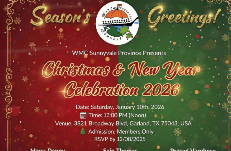 വേൾഡ് മലയാളി കൗൺസിൽ (WMC) സണ്ണി വെയ്ൽ പ്രൊവിൻസിന്റെ നേതൃത്വത്തിൽ 2026-ലെ ക്രിസ്മസ്, പുതുവത്സര ആഘോഷങ്ങൾ വിപുലമായ പരിപാടികളോടെ സംഘടിപ്പിക്കുന്നു. ജനുവരി 10 ശനിയാഴ്ച ഉച്ചയ്ക്ക് 12 മണിക്ക് ഗാർലാൻഡിലുള്ള മനോഹരമായ വേദിയിൽ വെച്ചാണ് (3821 Broadway Blvd, Garland, TX 75043) ആഘോഷങ്ങൾ നടക്കുന്നത്.