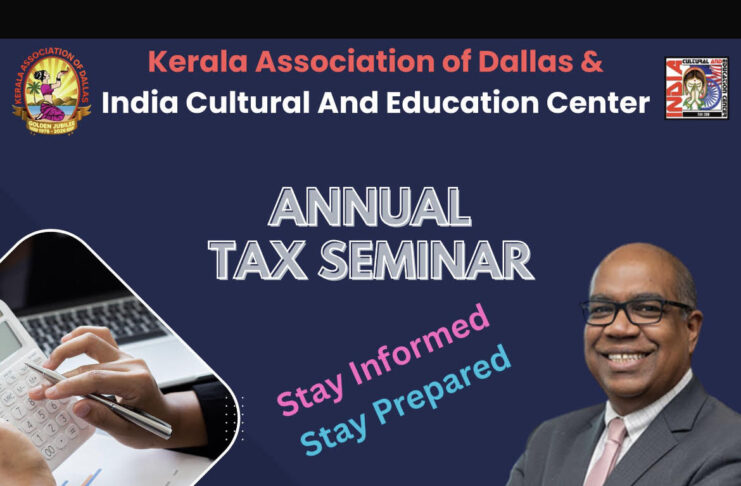 കേരള അസോസിയേഷൻ ഓഫ് ഡാളസും  ഇന്ത്യ കൾച്ചറൽ ആൻഡ് എഡ്യൂക്കേഷൻ സെന്ററും സംയുക്തമായി സംഘടിപ്പിക്കുന്ന വാർഷിക ടാക്സ് സെമിനാർ ജനുവരി 31 ശനിയാഴ്ച നടക്കും. പുതിയ നികുതി നിയമങ്ങൾ, ഫയലിംഗ് രീതികൾ എന്നിവയെക്കുറിച്ച് വ്യക്തികൾക്കും കുടുംബങ്ങൾക്കും വ്യക്തമായ ധാരണ നൽകുന്നതിനായാണ് ഈ സെമിനാർ സംഘടിപ്പിക്കുന്നത്.