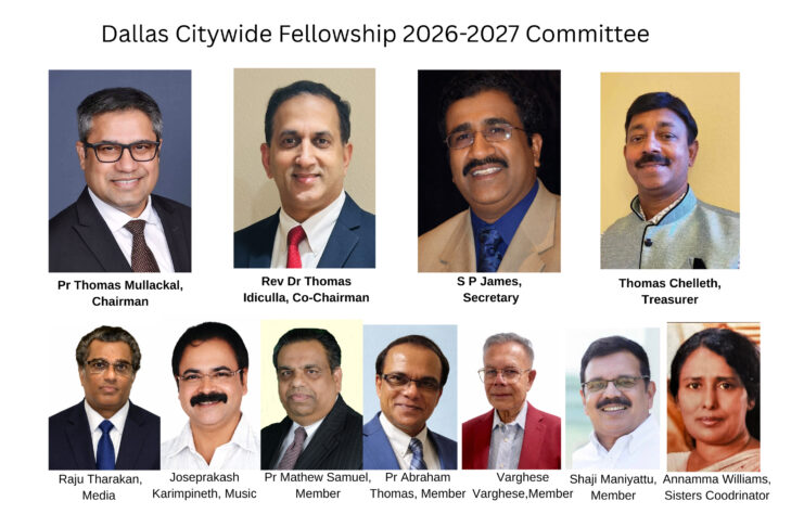 ഡാളസ് പട്ടണത്തിലെ മലയാളി പെന്തക്കോസ്തൽ സഭകളുടെ ഐക്യവേദിയായ ഡാളസ് സിറ്റി-വൈഡ് ഫെലോഷിപ്പിന്റെ ചെയർമാനായി പാസ്റ്റർ തോമസ് മുല്ലയ്ക്കലും കോ-ചെയർമാനായി ഡോ. തോമസ് ഇടിക്കുളയും സെക്രട്ടറിയായി എസ് പി ജെയിംസും ട്രെഷററായി തോമസ് ചെല്ലേത്തും തിരഞ്ഞെടുക്കപ്പെട്ടു. ഇക്കഴിഞ്ഞ നവംബർ 15-ന് ഡാളസിൽ കൂടിയ പൊതുയോഗത്തിൽ വച്ചാണ് 2026-2027 വർഷത്തേക്കുള്ള പുതിയ ഭാരവാഹികളെ തിരഞ്ഞെടുത്തത്. കഴിഞ്ഞ എട്ടുവർഷങ്ങളിലായി സിറ്റി-വൈഡ് ഫെലോഷിപ്പിന് നേതൃത്വം നൽകിയ പാസ്റ്റർ മാത്യു ശാമുവലിന്റെ പ്രവർത്തനങ്ങളെ യോഗം അനുസ്മരിക്കുകയുണ്ടായി.