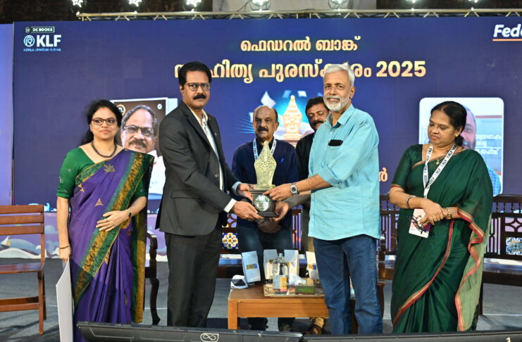 Photo Caption: ഫെഡറല് ബാങ്ക് സാഹിത്യ പുരസ്കാരം ബാങ്കിന്റെ കോഴിക്കോട് റീജിയണൽ മേധാവിയും ഡെപ്യൂട്ടി വൈസ് പ്രസിഡന്റുമായ പ്രമോദ് കുമാർ ടി വിയിൽ നിന്നും ഡോ. കെ ശ്രീകുമാർ അവാർഡ് ഏറ്റുവാങ്ങുന്നു.