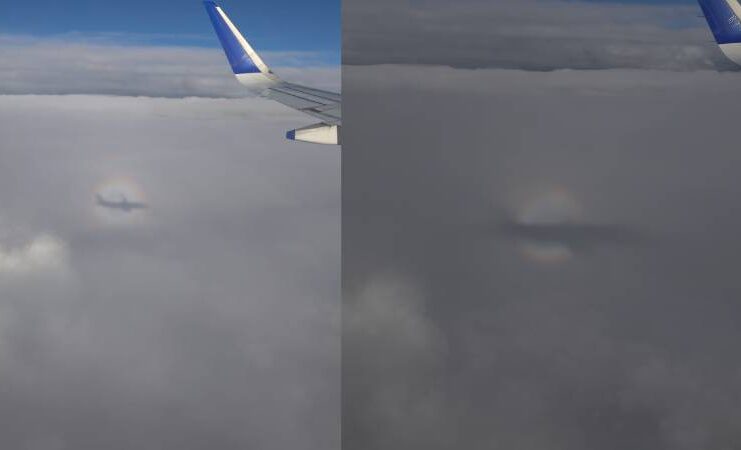വിമാനത്തിന്റെ നിഴൽ മേഘങ്ങളിൽ പതിയുമ്പോൾ, ആ നിഴലിനു ചുറ്റും മഴവില്ലിന്റെ നിറങ്ങളോടുകൂടിയ ഒരു വലയം (halo) ദൃശ്യമാകുന്നത് കണ്ടിട്ടുണ്ടോ? എന്നാൽ അത്തരമൊരു പ്രതിഭാസത്തിന്റെ ചിത്രം ഇപ്പോൾ വൈറലായിരിക്കുകയാണ്. പൈലറ്റ്സ് ഗ്ലോറി എന്ന പ്രതിഭാസമാണിത്. അഹമ്മദ്ബാദ്- കൊച്ചി ഇൻഡിഗോ വിമാനമാണ് പൈലറ്റ്സ് ഗ്ലോറി പ്രതിഭാസത്തിൽ പെട്ടത്. ഫെബ്രുവരി മൂന്നാം തീയതി വൈകുന്നേരം ഫ്ലൈറ്റ് യാത്രയ്ക്കിടെ ദിൽകുമാർ ശ്രീകുമാർ എളമക്കര പകർത്തിയ ചിത്രമാണ് കൗതുകം നിറക്കുന്നത്.