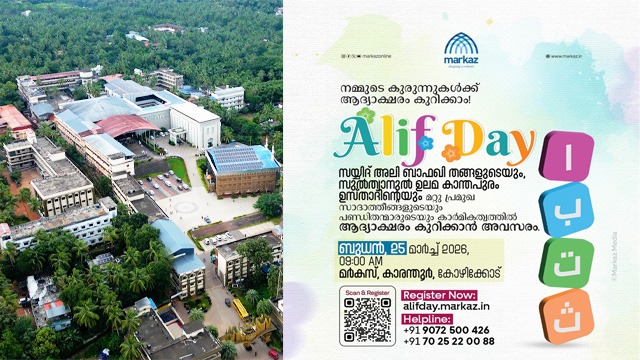 അറബി അക്ഷരമാലയിലെ ആദ്യാക്ഷരങ്ങൾ കുറിച്ചുനൽകുന്ന ചടങ്ങിനും പ്രാർഥനക്കും സന്ദേശപ്രഭാഷണത്തിനും സയ്യിദ് അലി ബാഫഖി തങ്ങൾ, സി മുഹമ്മദ് ഫൈസി, വി.പി.എം ഫൈസി വില്യാപ്പള്ളി, സയ്യിദ് ശറഫുദ്ദീൻ ജമലുല്ലൈലി, ഡോ. മുഹമ്മദ് അബ്ദുൽ ഹകീം അസ്ഹരി, ഡോ. ഹുസൈൻ സഖാഫി ചുള്ളിക്കോട്, സയ്യിദ് മുഹമ്മദ് തുറാബ് സഖാഫി, സയ്യിദ് ശിഹാബുദ്ദീൻ അഹ്ദൽ മുത്തനൂർ, സയ്യിദ് അബ്ദുസ്വബൂർ ബാഹസൻ നേതൃത്വം നൽകും. പങ്കെടുക്കാൻ ആഗ്രഹിക്കുന്നവർക്ക് alifday.markaz.in എന്ന വെബ്സൈറ്റ് ലിങ്ക് വഴി മാർച്ച് 24നകം രജിസ്റ്റർ ചെയ്യാവുന്നതാണ്. കൂടുതൽ വിവരങ്ങൾക്ക്: 9072500426