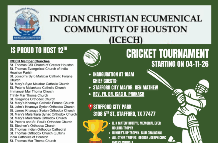 3108, 5th Street-ൽ സ്ഥിതി ചെയ്യുന്ന സ്റ്റാഫോർഡ് സിറ്റി പാർക്കിലാണ് മത്സരങ്ങൾ നടക്കുന്നത്. ഹൂസ്റ്റണിലെ വിവിധ ഇടവകകളിൽ നിന്നുള്ള കരുത്തരായ 14 ടീമുകൾ പങ്കെടുക്കുന്ന ഈ ടൂർണമെന്റ് ക്രിക്കറ്റ് പ്രേമികൾക്കും കായിക താരങ്ങൾക്കും ഒരുപോലെ ആവേശം പകരുന്നതായിരിക്കുമെന്ന് സംഘാടകർ അറിയിച്ചു.