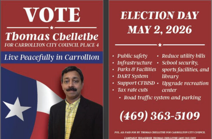 അമേരിക്കയിലെ കാരൾട്ടൺ സിറ്റി കൗൺസിലിലേക്ക് നടക്കുന്ന തിരഞ്ഞെടുപ്പിൽ പ്രമുഖ മലയാളി പൊതുപ്രവർത്തകൻ തോമസ് ചെള്ളേത്ത് മത്സരിക്കുന്നു. ഇന്ത്യൻ ക്രീക്ക് ഹോം ഓണേഴ്സ് അസോസിയേഷൻ വൈസ് പ്രസിഡന്റ് എന്ന നിലയിലും വിവിധ സാമൂഹിക സംഘടനകളിലെ സജീവ സാന്നിധ്യമായും ശ്രദ്ധേയനായ അദ്ദേഹം, നഗരത്തിന്റെ വിപുലമായ വികസന പദ്ധതികൾ മുൻനിർത്തിയാണ് ജനങ്ങളെ സമീപിക്കുന്നത്.