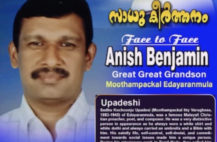 പ്രശസ്ത ക്രൈസ്തവ പ്രസംഗകനും ഗാനരചയിതാവുമായിരുന്ന സാധു കൊച്ചുഞ്ഞ് ഉപദേശിയുടെ സ്മരണാർത്ഥം “സ്വർഗീയ നാദം” സംഘടിപ്പിക്കുന്ന ‘സാധു കീർത്തനം’ ലൈവ് സ്ട്രീമിംഗ് മ്യൂസിക് കൺസേർട്ട് ഏപ്രിൽ 24 വെള്ളിയാഴ്ച നടക്കും. സാധു കൊച്ചുഞ്ഞ് ഉപദേശിയുടെ (മൂത്തമ്പാക്കൽ ഇടയാറന്മുള) കൊച്ചുമകന്റെ മകനായ അനീഷ് ബെഞ്ചമിൻ ആണ് ഈ ‘ഫേസ് ടു ഫേസ്’ പരിപാടിയിൽ മുഖ്യാതിഥിയായി എത്തുന്നത്.